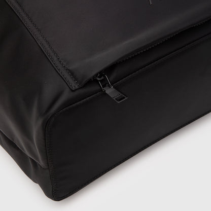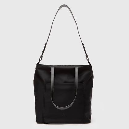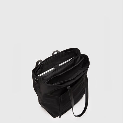 Tote funcional y versátil, confeccionado en 100% nylon tanto en su exterior como interior. Cuenta con dos bolsillos frontales de acceso rápido: uno con cierre y otro diseñado para abrirse y enganchar el tote a la asa de la maleta, ideal para viajar. En su interior incorpora dos amplios compartimientos principales, un bolsillo pequeño de rápido acceso para celular o billetera, un compartimiento elasticado para botellas, un gancho para llaves y un bolsillo interior con cierre. Perfecto para la ciudad, la oficina o viajes, combinando organización, comodidad y estilo.